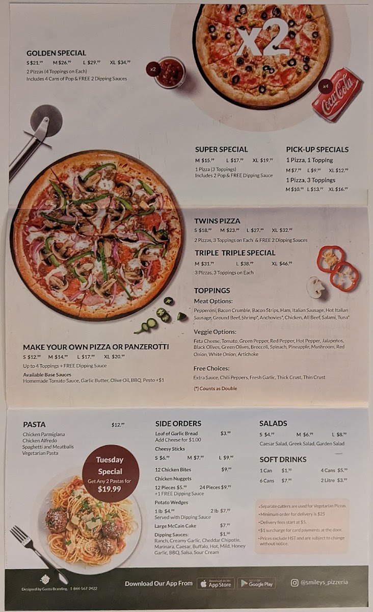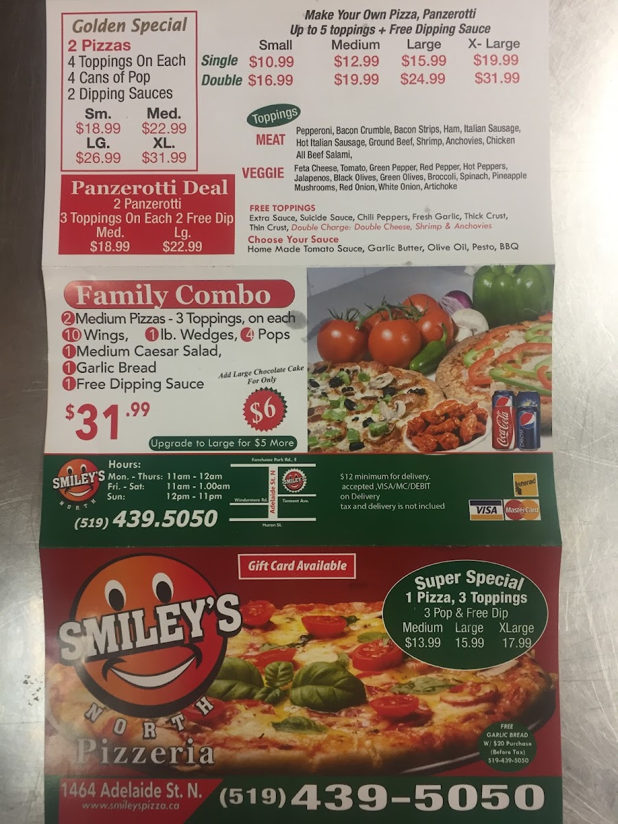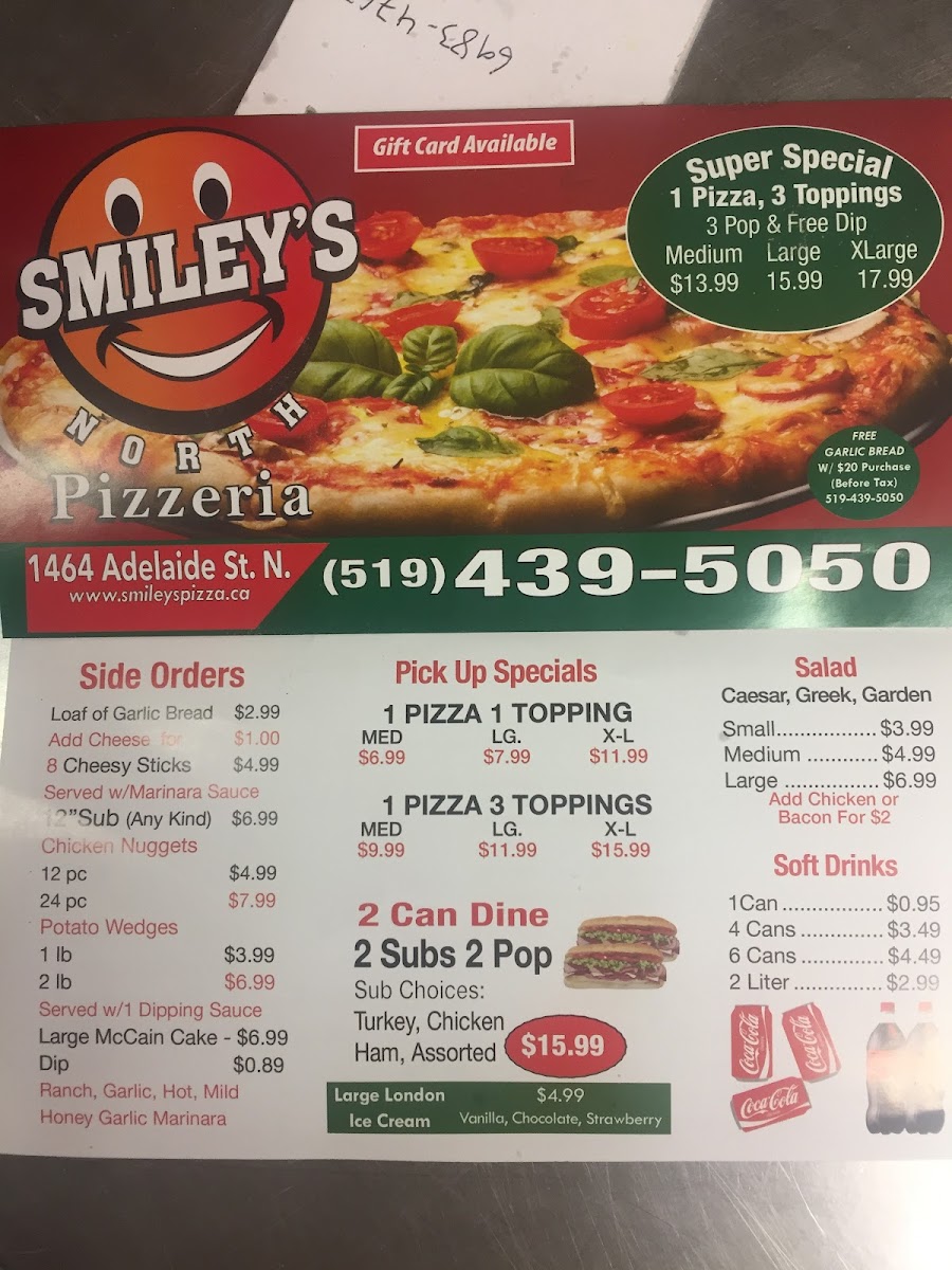 Welcome to Smiley's Pizzeria, your ultimate destination for pizza lovers in London, ON! Located at 1464 Adelaide St N, Smiley's showcases a delightful menu that balances affordability and flavor. Dive into their signature pizzas, offering an enticing selection from one-topping delights to robust three-topping combinations. The generous use of toppings and perfectly melted cheese sets them apart, making each slice a scrumptious experience.